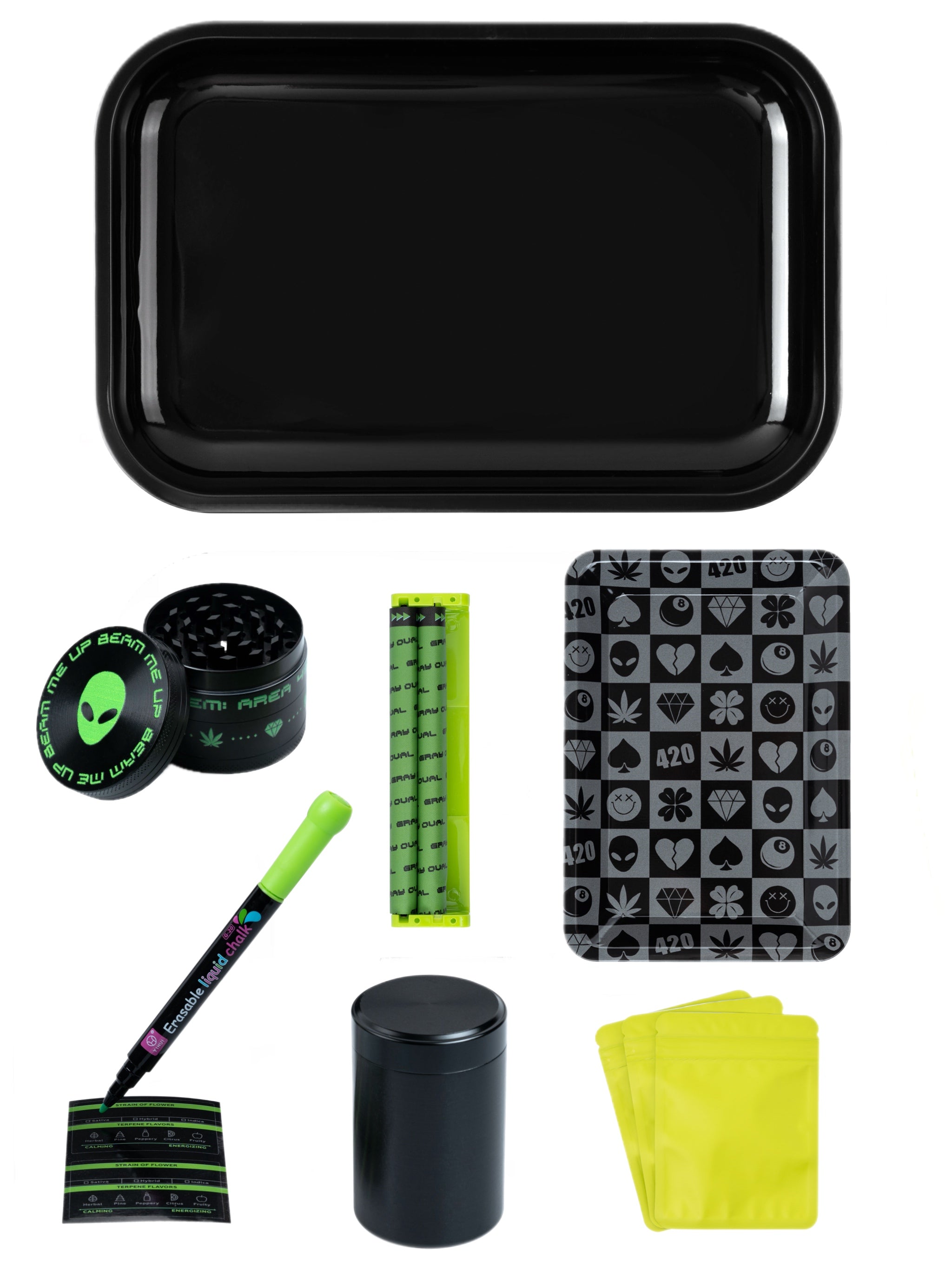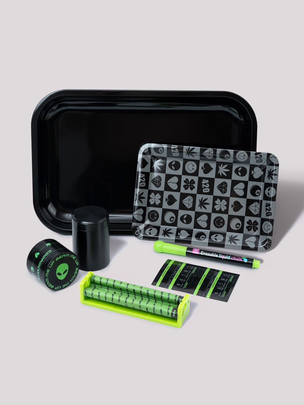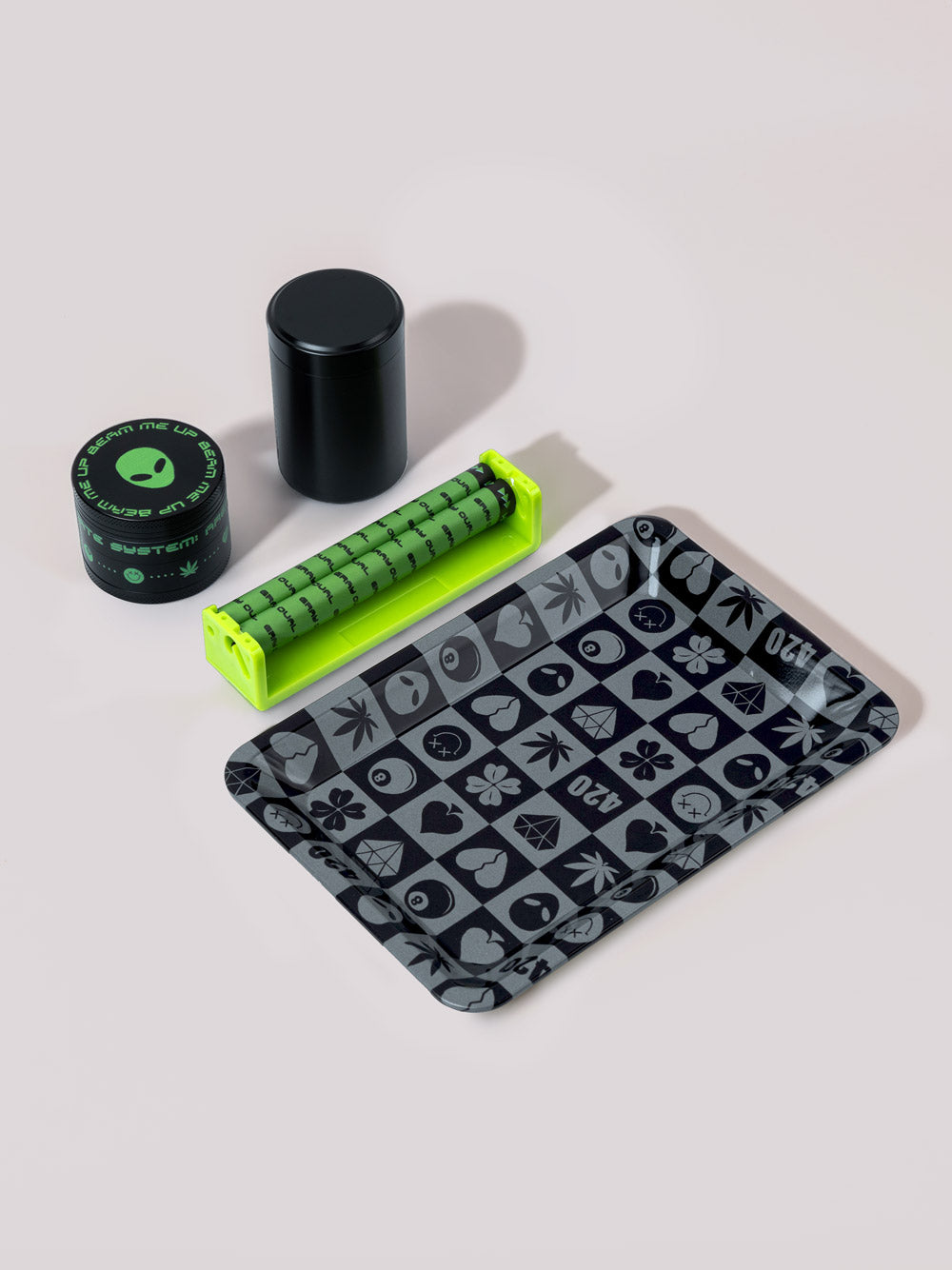 Rolling Trays: Sturdy metal trays — large (11 x 7 inches) for intergalactic rolling space, and small (7 x 5 inches) for out-of-this-world portability.
